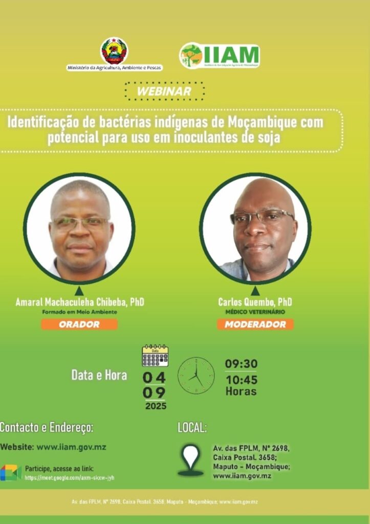 Hoje, 04 de setembro, realizou-se um webinar sobre “Identificação de bactérias indígenas de Moçambique com potencial para uso em inoculantes de soja”. O evento contou com a participação do Dr. Amaral Machaculeha Chibeba como orador principal e do Dr. Carlos Quembo como moderador.